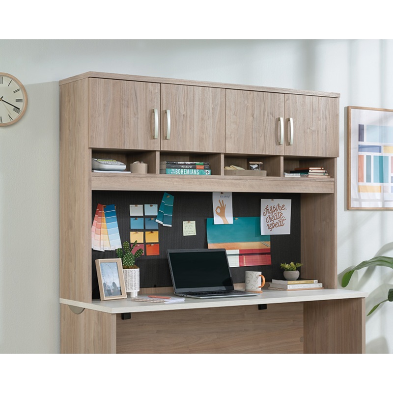 Attaches to Credenza 441405. Hidden storage behind doors provides optimized organization. Cubbyhole areas provide additional storage. Fabric-covered bulletin board for easy-to-share reminders and more. Meets BIFMA standard x5.5 for safety, durability, and structural performance. Harvest Walnut finish.